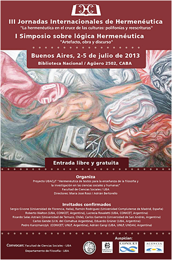 Se encuentra abierta la convocatoria a la presentación de resúmenes para las III Jornadas Internacionales de Hermenéutica:«La hermenéutica en el cruce de las culturas: polifonías y reescrituras» que se realizarán en la Ciudad Autónoma de Buenos Aires los días 3, 4 y 5 del mes de Julio de 2013. Como preludio a las Jornadas, tendrá lugar el I Simposio sobre Lógica Hermenéutica: artefacto, obra y discurso el día 2 de julio. Ambos eventos se desarrollarán en la Biblioteca Nacional, Agüero 2502.